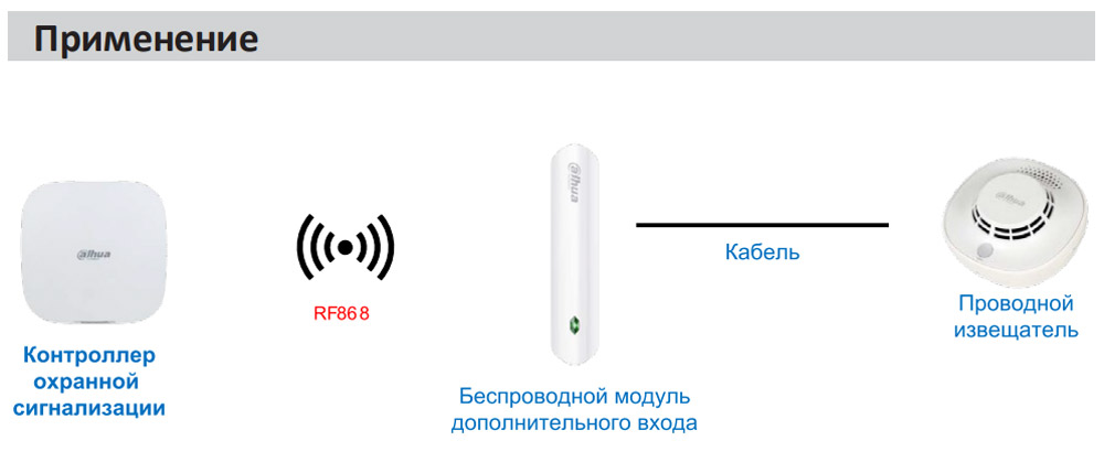 Беспроводной модуль дополнительного входа представляет собой преобразователь беспроводного интерфейса в проводной интерфейс (тревожный вход), которому подключается сторонний проводной извещатель для пересылки его сигналов тревоги на контроллер охранной сигнализации. Его можно настроить через мобильное приложение DMSS для смартфонов iOS и Android.