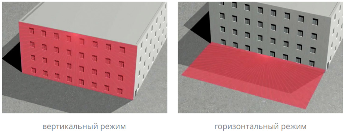 Возможность установки извещателя в вертикальном и горизонтальном положении позволяет использовать его для создания охранной зоны параллельно поверхности земли или для формирования виртуальной стены.