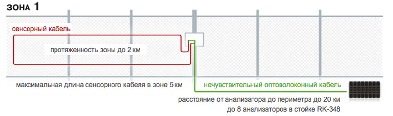 Анализаторы могут быть подключены к сенсорному кабелю при помощи стандартного оптического кабеля, расстояние до охраняемого периметра может составлять при этом до 20 км.
