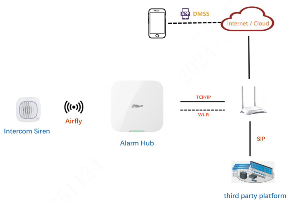 Беспроводная интерком-сирена активирует звуковую и световую сигнализацию при получении сигналов тревоги. Она также предлагает функцию интеркома, которую можно включить в DMSS и мобильном приложении DoLynk Care, что упрощает общение с людьми на вашем объекте. Центр безопасности также может использовать интерком для связи с вашим объектом через сирену.