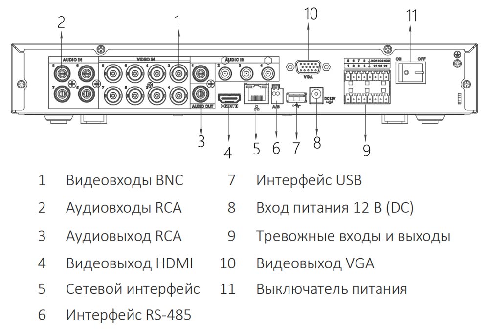 • Аналоговые каналы: 8 BNC (автоматическое определение типа видеосигнала по умолчанию, возможность выбора вручную HDCVI, AHD, TVI и CVBS)