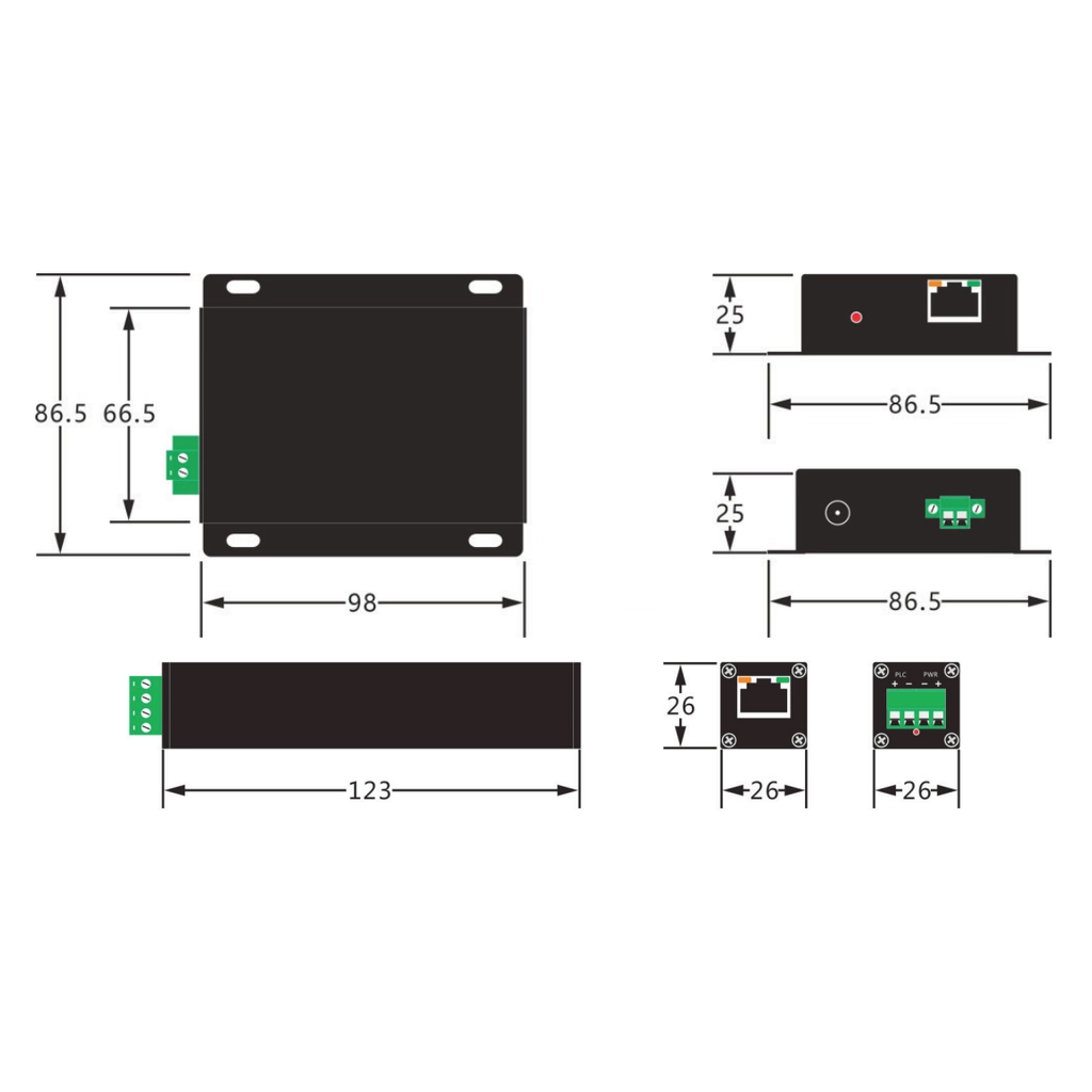 - Габаритные размеры: 98(Д) × 86.5(Ш) × 25(В) мм / 123(Д) × 26(Ш) × 26(В) мм