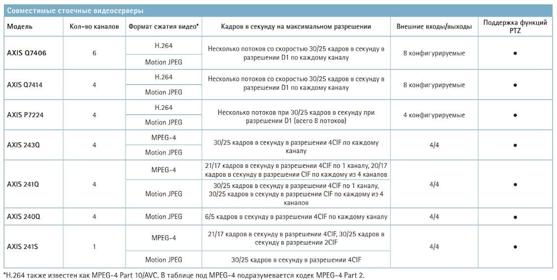 В зависимости от модели стоечного видеосервера стойка AXIS 291 1U обеспечивает поддержку сжатия в формате H.264. Видеосервер обеспечивает функции управления наклоном/поворотом/увеличением (PTZ) по сети всеми представленными на рынке видеокамерами от ведущих производителей.