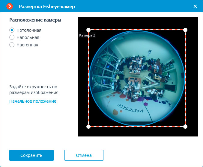 В настройках нужно выбрать расположение камеры: Потолочная, Напольная или Настенная; и задать окружность, совпадающую с границами изображения (окружность задаётся путём перетаскивания мышью углов квадрата, ограничивающего окружность).