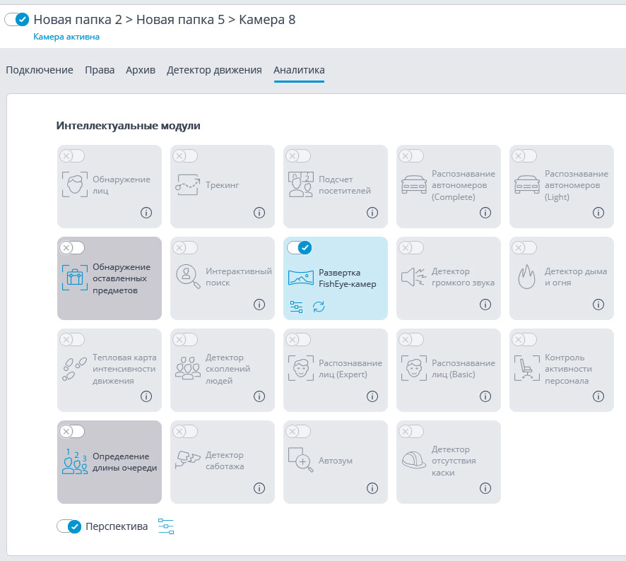 Модули Автозум, Развертка FishEye-камер и Размытие областей кадра являются взаимоисключающими. Таким образом, на одной камере можно использовать только один из этих модулей.