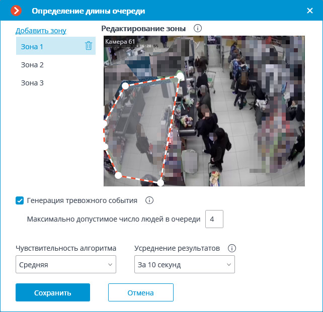 Оператор системы видеонаблюдения может настроить до 6 зон детектирования очереди на одну камеру, а также пороговое значение числа людей в одной зоне. При превышении этого порогового значения будет подан сигнал тревоги.
