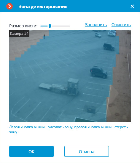 Зона детектирования — область кадра, заполненная в окне настройки полупрозрачной синей заливкой. Для изменения зоны следует пользоваться мышью: левая кнопка служит для заполнения зоны, правая — для очистки. С помощью кнопок Заполнить и Очистить можно соответственно заполнить или очистить всю область кадра. С помощью ползунка можно изменять Размер кисти выделения.