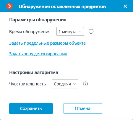 Задать размеры детектируемых объектов — открывает окно, в котором задаются минимальные и максимальные размеры отслеживаемых объектов, которые могут считаться оставленными.