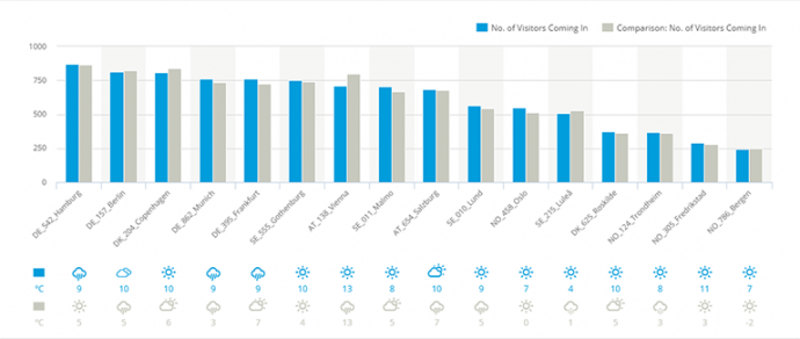 В службе AXIS Store Reporter предусмотрены готовые аналитические отчеты с широкими возможностями настройки. Например, в отчете могут быть представлены статистические данные в зависимости от погодных условий в разные дни, что позволяет судить о наличии или отсутствии влияния погоды на итоговые показатели. Отчеты и полученные результаты, включая изображения на панели, можно экспортировать в форматы PDF и Excel®. Кроме того, служба AXIS Store Reporter может работать с данными кассового терминала; однако эта возможность не предусмотрена в стандартном устройстве за обычную цену.