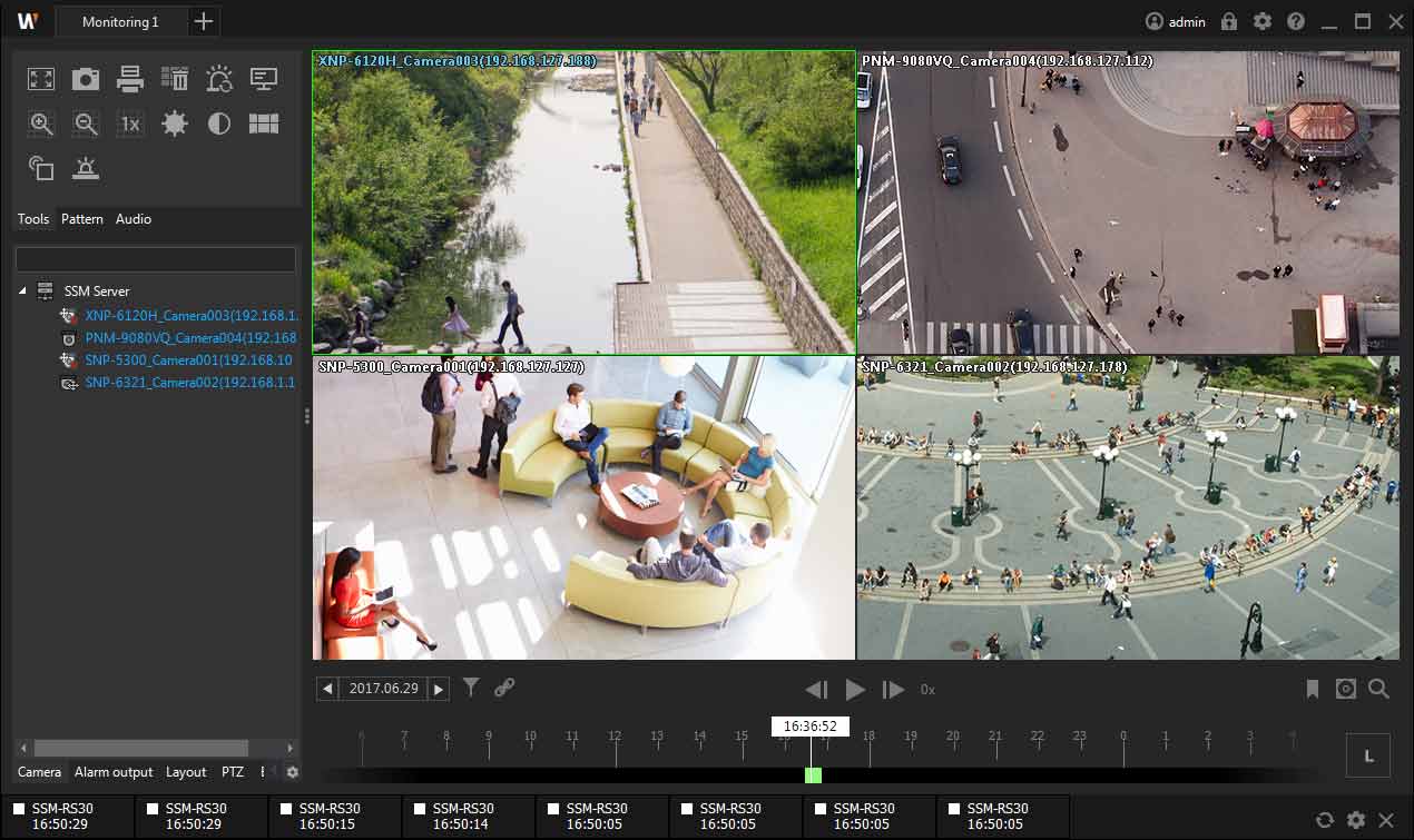 Русифицированное ПО Wisenet SSM компании Hanwha Techwin предназначено для управления системами видеонаблюдения на базе IP-камер, тепловизоров, видеорегистраторов, серверов и другого оборудования, а также совместимо с аудиосистемой WAMS. Оно обеспечивает просмотр «живого» и воспроизведение архивного видео, управление видео/аудиозаписью и настройку алгоритмов реагирования на события тревоги. SSM имеет модульную клиент-серверную архитектуру и предоставляет возможность создания как небольших локальных, так и крупных территориально-распределенных многосерверных систем.