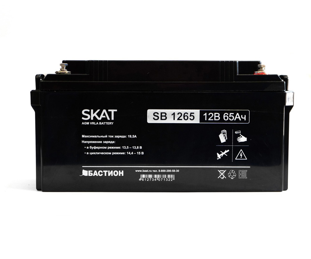 Аккумулятор герметичный свинцово-кислотный необслуживаемый SKAT SB 1265, производимый по технологии AGM с системой рекомбинации газов VLRA, предназначен для использования в составе системы резервного питания.