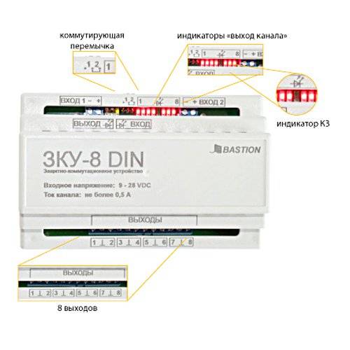 Защитно-коммутационное устройство ЗКУ-8 DIN предназначено для распределения тока источника питания аппаратуры ОПС по 8 каналам и защиты каждого канала по току при помощи самовосстанавливающихся предохранителей. ЗКУ выпускается в исполнении на DIN рейку 35 мм и легко монтируется в стойки и электротехнические шкафы.