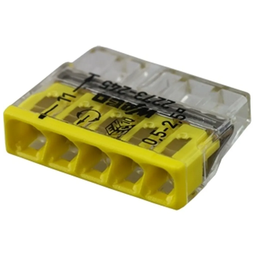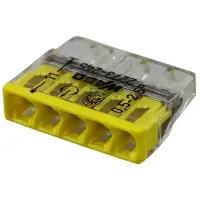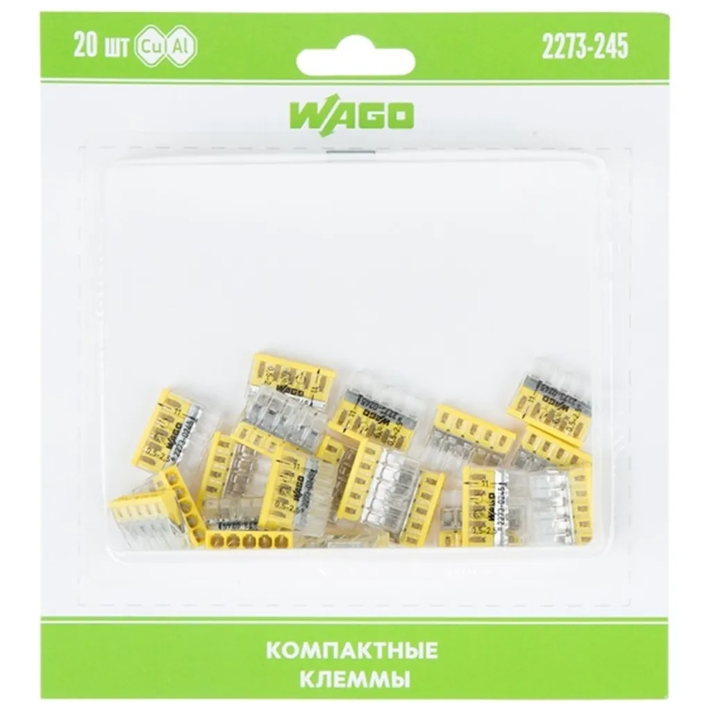 Элетромонтажные экспресс-клемы WAGO 2273-245 позволят безопасно и быстро соединить 5 проводов между собой (алюминиевые и медные как одножильные, так и многожильные). Достаточно просто вставить жилу кабеля или провода в клемму и самозажимной контакт надежно зафиксирует соединение. Диаметр соединяемых проводов должен составлять в сечении от 0,5 до 2,5 мм2. Номинальный ток 24А; Номинальное напряжение 450В. Удобные тестовые гнёзда, прозрачный корпус для визуального контроля и смотровое окно для проверки защиты от касаний делают работу более безопасной. Наличие пасты обеспечивает надёжную изоляцию контакта.