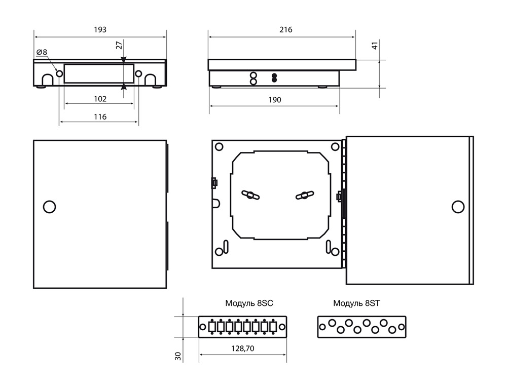 ввод кабелей производится с торца корпуса; съемные планки (панели) для установки проходных адаптеров также крепятся снаружи в торце корпуса. Модель на 4 порта (FO-WBY-4UN) имеет съемный кожух с фиксацией одним винтом, а модель на 8 портов (FO-WBY-8UN) оборудована дверцей с замком.