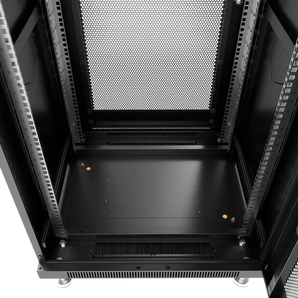 Корпус выполнен из холоднокатаной стали с тщательно продуманной толщиной элементов: монтажный профиль 2,0 мм, несущая конструкция 1,5 мм, остальные части 1,2 мм. Это обеспечивает статическую нагрузку до 800 кг и долговечность шкафа при интенсивной эксплуатации. В верхней и нижней части предусмотрены щеточные вводы для аккуратного и безопасного ввода силовых и слаботочных кабелей, а в днище — люки с заглушками. Для организации воздушного потока можно дополнительно установить вентиляторный модуль в крышу, что особенно важно при размещении плотнозаполненных стоек с активным оборудованием.