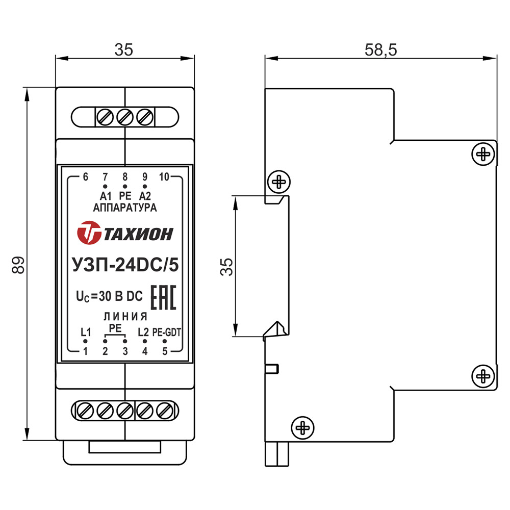 Конструктивно УЗП-24AC/5 выполнено в пластмассовом корпусе с креплением на 35мм DIN-рейку.