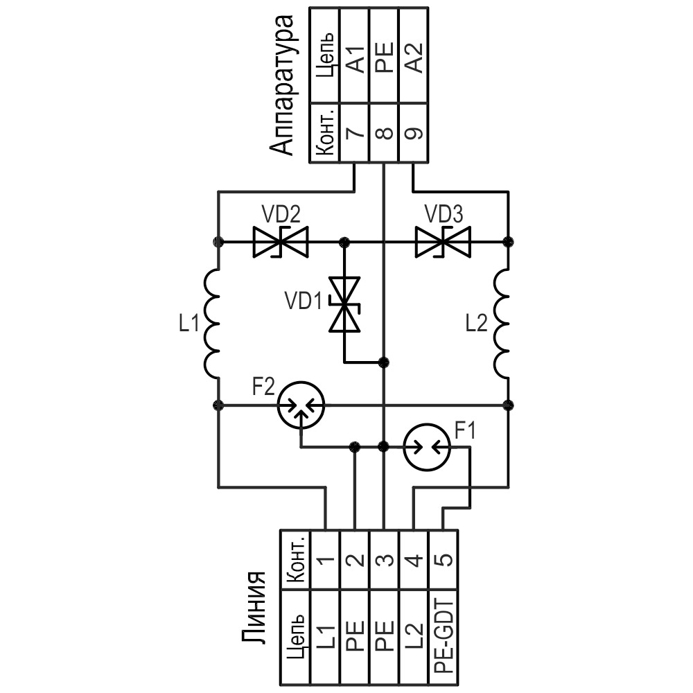 - Линия – земля: (A1, A2, PE) относительно (PE-GDT): 600 В