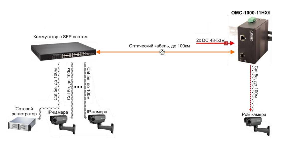 • DC48-53V(>35Вт) для модели OMC-1000-11HX/I с поддержкой РоЕ (подойдут модели OSNOVO PS-48048/I, PS-48120/I и др.).