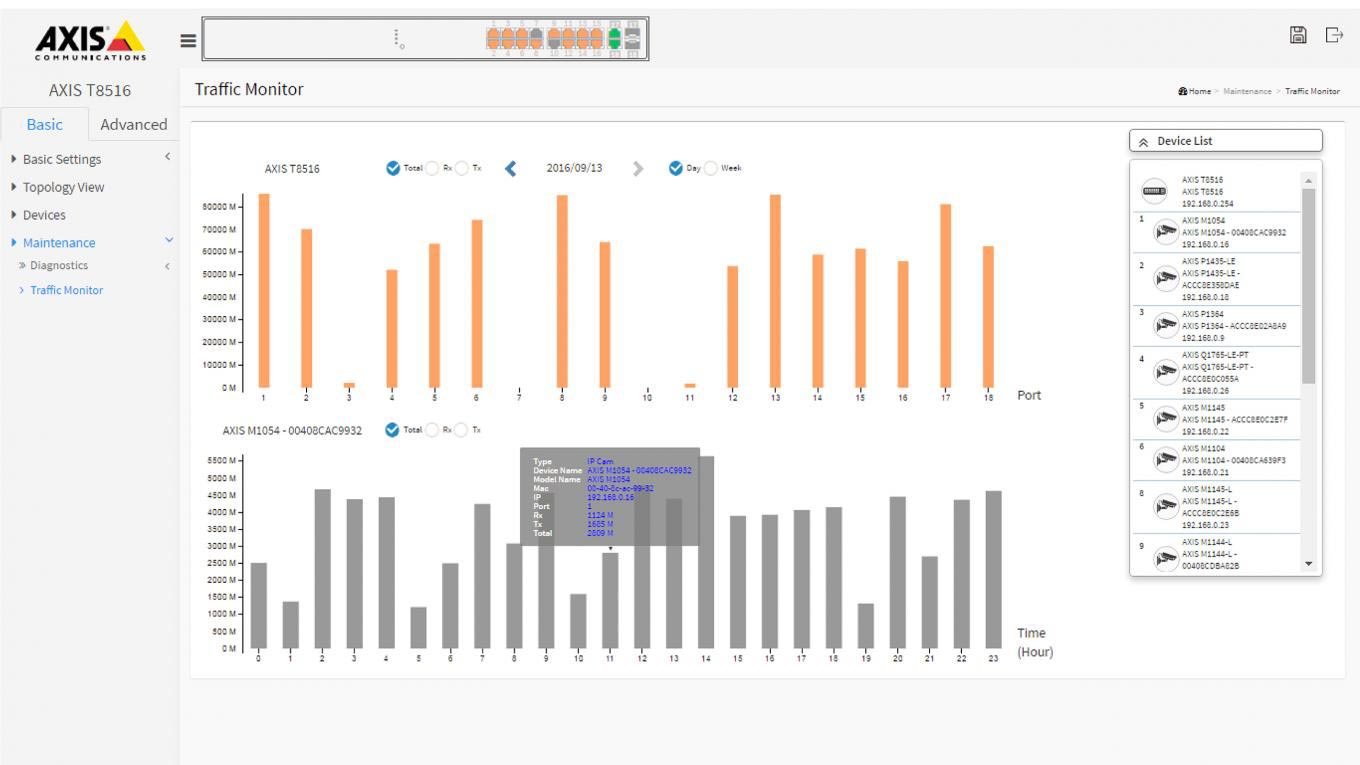 Уникальный графический веб-интерфейс пользователя, наглядно отображающий топологию системы, позволяет видеть все устройства. Помимо этого, графический интерфейс предоставляет информацию о подключенных устройствах, их состоянии и соответствующих уведомлениях. С его помощью можно управлять всеми подключенными устройствами, перезагружать камеры в системе, отслеживать сетевой трафик, выполнять диагностику кабелей и многое другое.