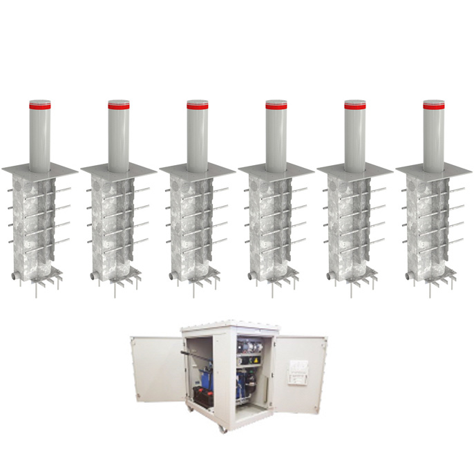Монтаж осуществляется с использованием бетона класса С30 и стальной железобетонной арматуры. Перед заливкой бетона необходимо провести работы по планировке и подготовке грунта. Допустимая несущая способность грунта должна быть не менее 1/2 кг/см2; в противном случае необходимо приостановить работы до выполнения данного требования. Монтаж должен осуществляться в соответствии с указаниями производителя. Возможность установки нескольких постов с боллардами, управляемых одной гидравлической силовой установкой (ГСУ). В случае установки нескольких заграждений рекомендуется обеспечить зазор 1200 мм между постами с боллардами.
