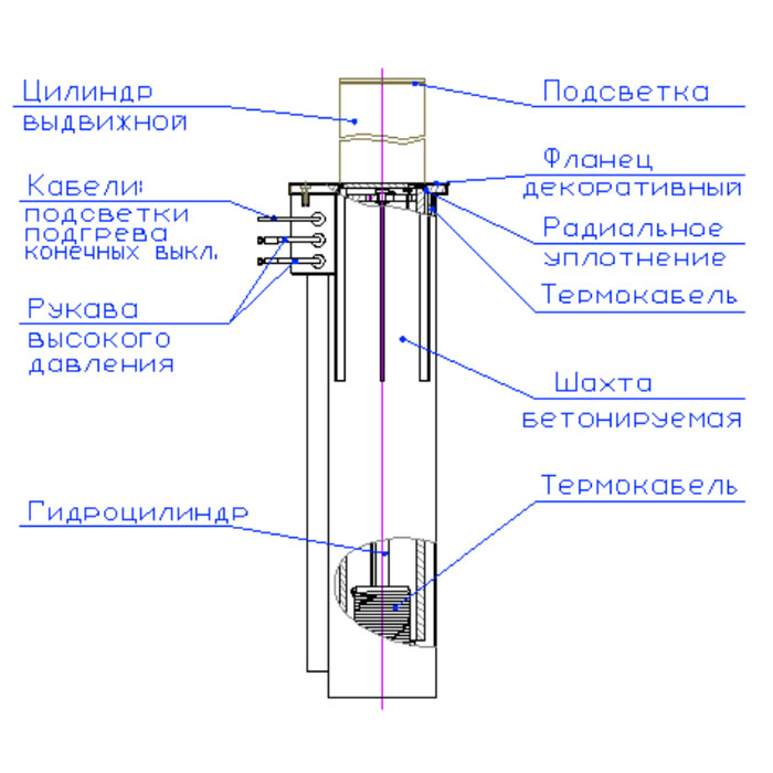 Цилиндр выдвижной является основным блокирующим заградительным элементом, представляет собой гладкую толстостенную трубу, на которую надета тонкостенная рубашка из нержавеющей стали. В верхней части цилиндра выдвижного имеется нержавеющий фланец, под ним располагается светодиодная лента.