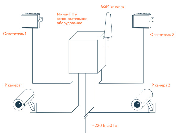 Данный вариант установки применяется на объектах с большим потоком машин (автомобильные трассы, городские дороги) и в аппаратно-программных комплексах «Безопасный город». Производительный мини-компьютер Intel NUC позволяет обрабатывать поступающие данные сразу на месте и передавать их из локальной базы данных в центральную, используя gsm-каналы данных с низкой пропускной способностью. Это исключает необходимость дорогостоящих работ по прокладке линий связи.