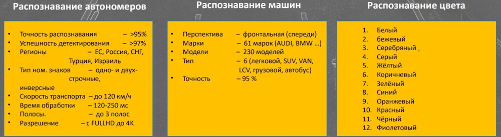 • Точность распознавания более 95% камерами с процессором ARTPEC-6, 2-х полосном движении на скорости до 160 км/ч
