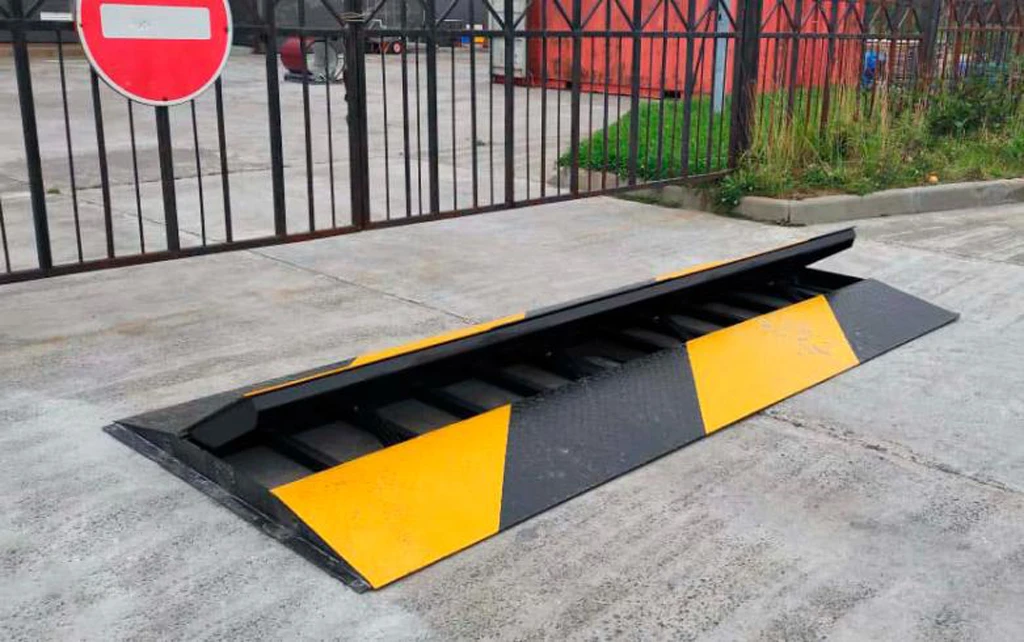 - Накладной дорожный блокиратор выполнен в форме поката - лежачего полицейского и в закрытом положении позволяет беспрепятственно проезжать любому транспорту.