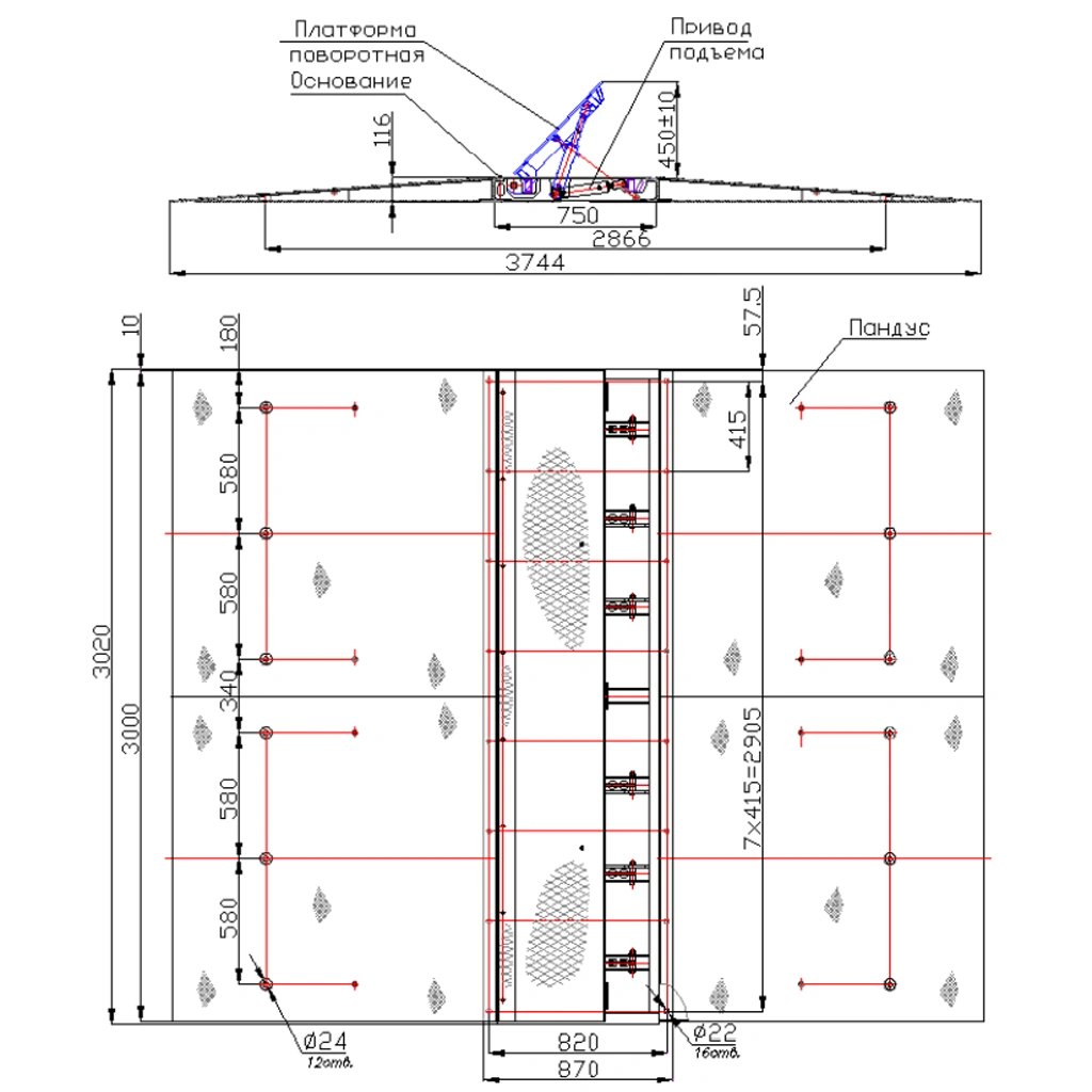 - ПЗП 3000Гн - Длина 3020 мм, Ширина с пандусами 3744 мм, Высота преграды 116 мм, Высота подъема 450 мм
