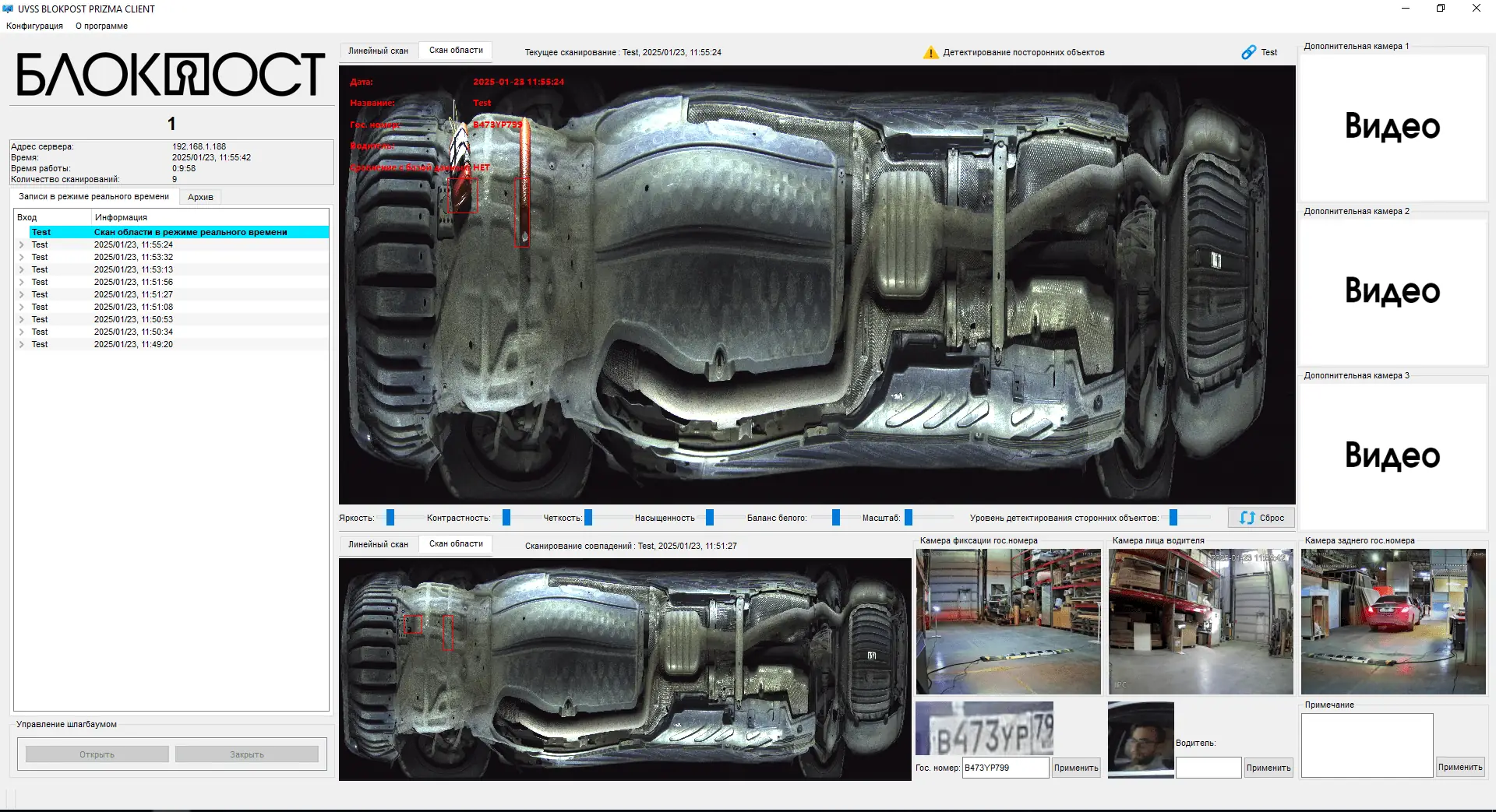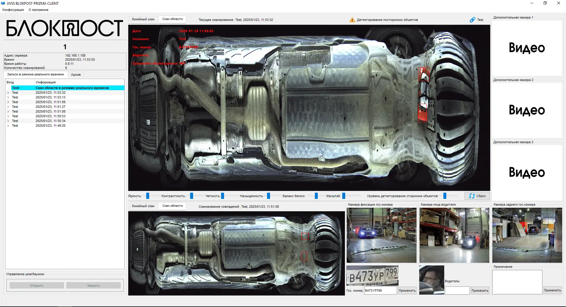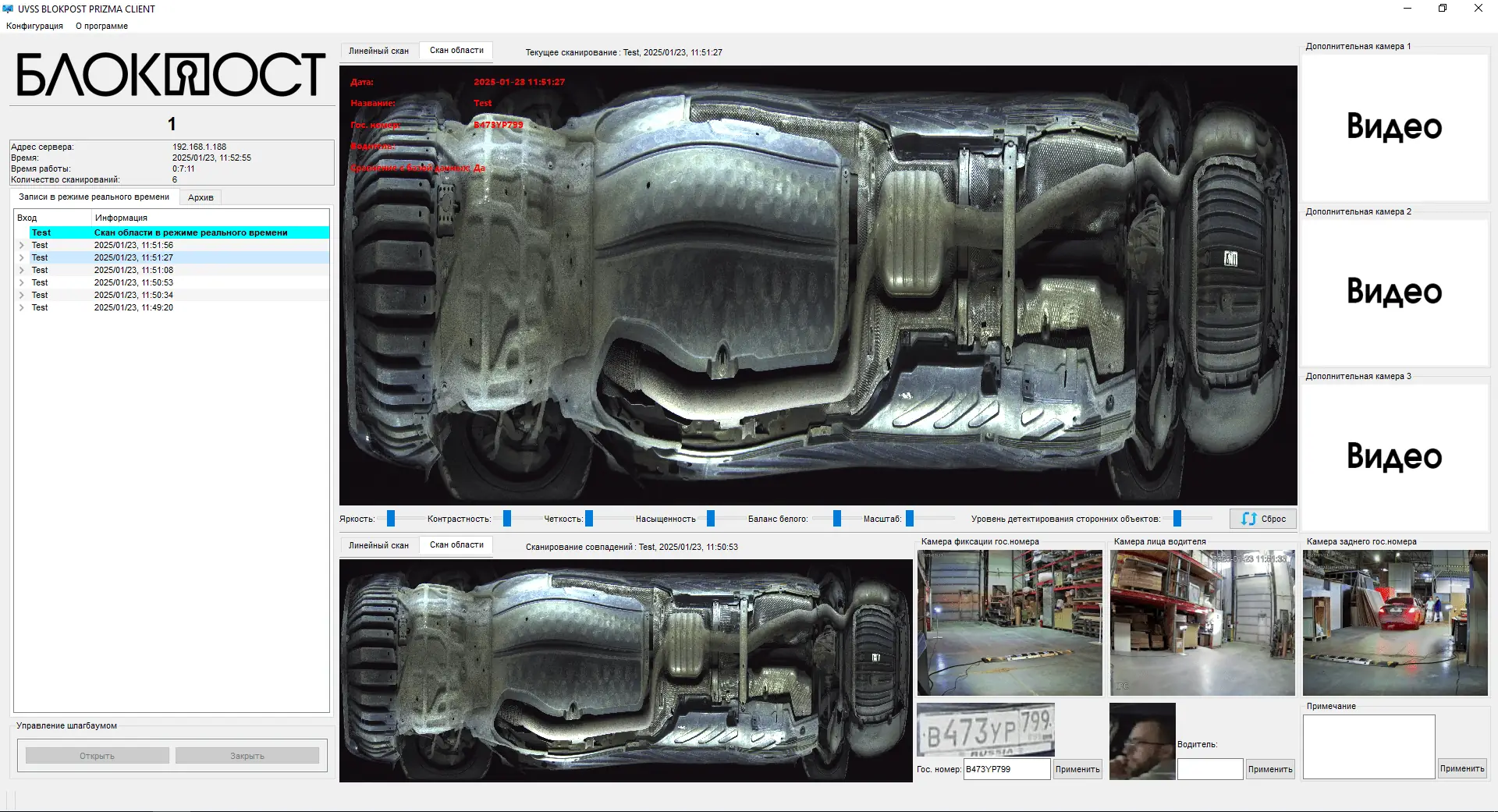 При подъезде автомобиля система активирует подсветку и готовность сканирования. В процессе проезда модуль формирует высокодетализированное изображение днища, а передняя и задняя LPR-камеры фиксируют государственные регистрационные знаки. Камера водителя записывает лицо для идентификации. Готовое изображение отображается оператору на рабочем месте, сохраняется в базе данных и может быть использовано для дальнейшего анализа и сопоставления при повторных въездах. Интерфейс программы позволяет управлять периферийным оборудованием въездной группы.