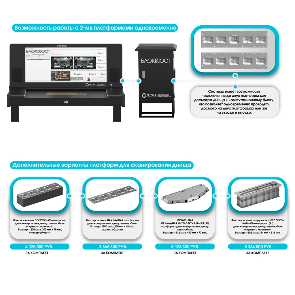 Стационарная система сканирования днища автомобиля БЛОКПОСТ PRIZMA 01 C — профессиональный комплекс для контроля транспортных средств на КПП и периметрах с повышенными требованиями к безопасности. Решение сочетает технологии линейного и площадного сканирования, формируя детализированное изображение нижней части автомобиля в реальном времени для выявления контрабанды, оружия, закладок и иных угроз.