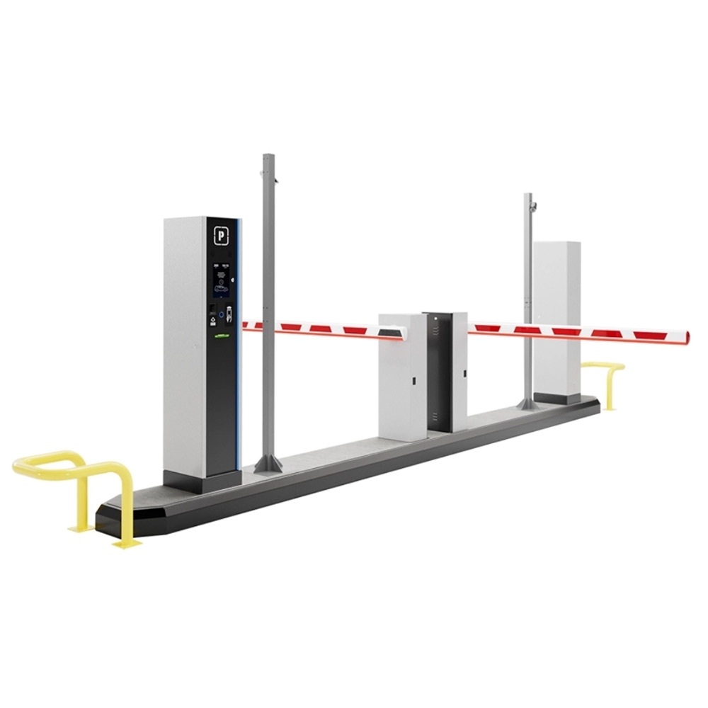 Кронштейн выезда крепится на торцевом элементе, через 1,5 метра устанавливается шлагбаум выезда, через 1,5 метра – стойка въезда, через 10 см – стойка выезда, через 1,5 метра – шлагбаум въезда, через 1,5 метра – кронштейн въезда.