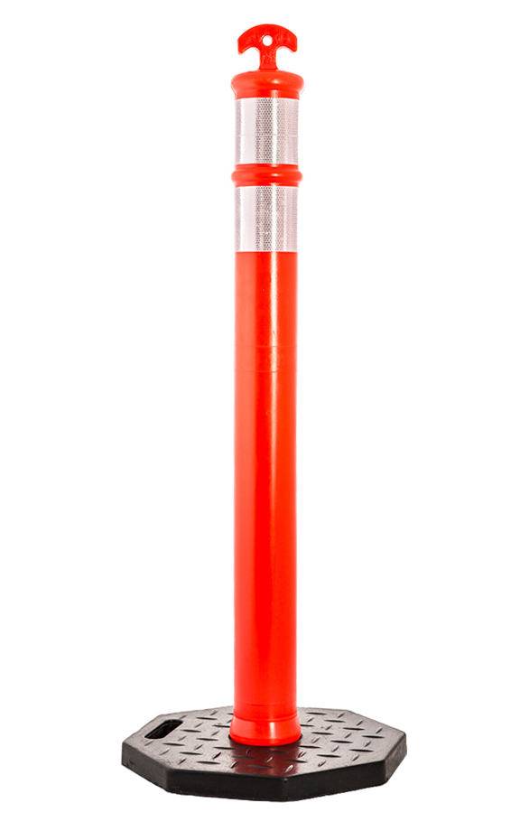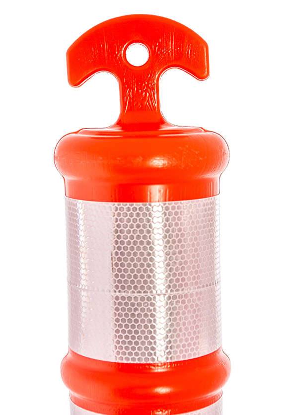 Столбик круглого сечения из красного пластика с нанесенной светоотражающей полосой белого цвета. В верхней части столба имеется крючок для переноса изделия, а также для присоединения цепи. Основа - резиновая подставка восьмигранной формы. Подставка надевается на изделие сверху и надежно фиксируется в нижней части. Подставка оснащена ручками для удобства переноса.