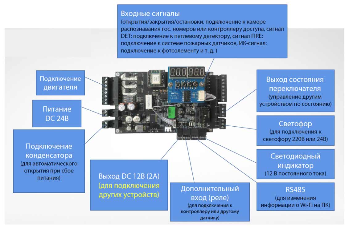 К шлагбауму возможно подключение видеокамер с функцией распознавания автомобильных номеров, считывателя радиометок дальнего действия, радар-детектора, инфракрасного или петлевого детектора для реализации автооткрытия/закрытия.