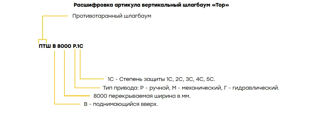 Модель «Тор» оснащается электромеханическим приводом и устанавливается на дорожное полотно. Ширина перекрываемого проезда составляет от 3 до 6 м, при этом высота стрелы в закрытом положении — 940 мм. Конструкция рассчитана на восприятие энергии удара до 1234 кДж, что позволяет эффективно останавливать транспорт массой нескольких тонн. Класс защиты IP54 гарантирует устойчивость к пыли и влаге, а прочное антикоррозионное покрытие защищает корпус от воздействия окружающей среды.