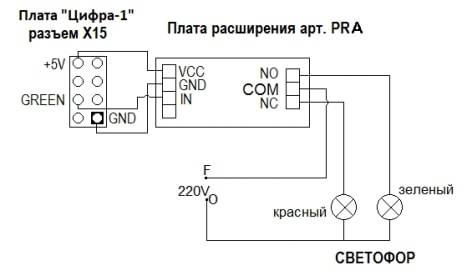 На рисунке показано подключение светофора на 220В. Для подключения светофора на 12В или 24В необходимо в цепь питания светофора включать блок питания на соответствующего напряжения.