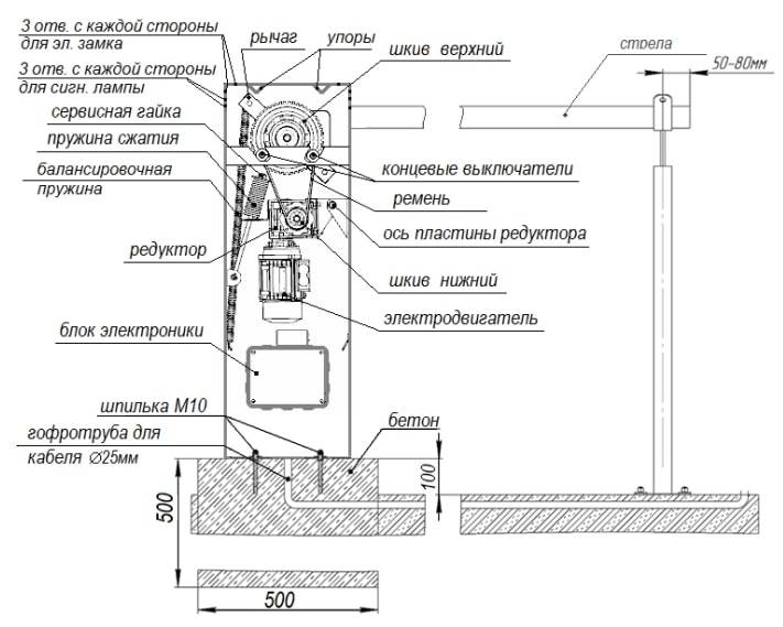 Шлагбаум следует установить на фундамент размером 500x500x500 из бетона марки не ниже М400. При заливке необходимо использовать монтажный комплект: монтажную раму и анкеры, при этом каждый анкер должен выступать над поверхностью фундамента своей резьбовой частью на высоту не менее 40 мм. Сам фундамент должен выступать над уровнем проезжей части не менее 100мм.