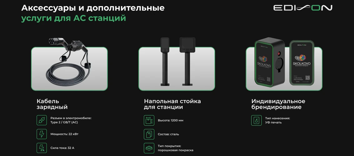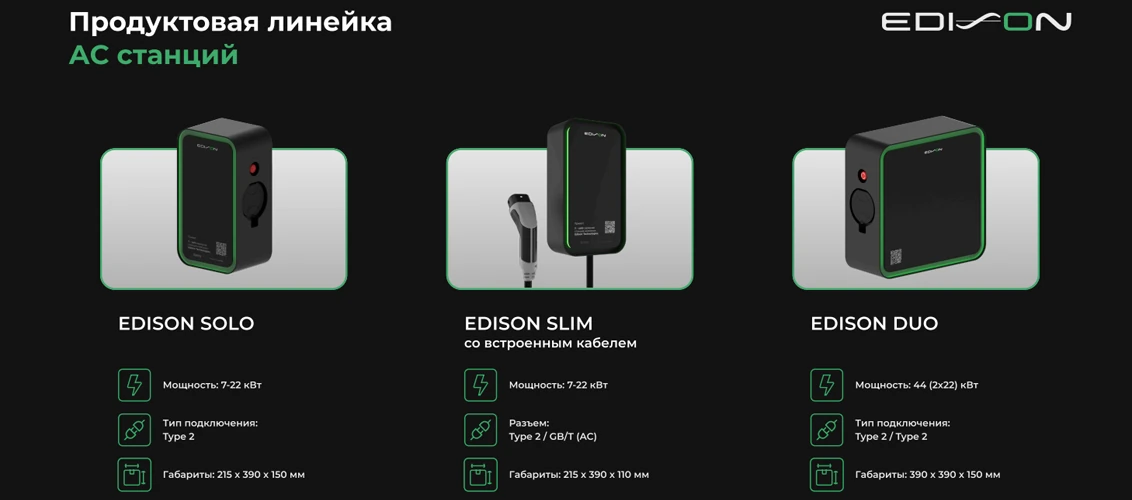 Зарядная станция Edison SOLO — одна из самых компактных станций на отечественном рынке. Она отличается небольшими габаритами, что делает ее удобной для размещения как в частных владениях, так и на коммерческих объектах. Корпус станции выполнен из прочных материалов, устойчивых к суровым погодным условиям, включая сильные морозы, высокие температуры, осадки и запыленность, что обеспечивает длительный срок службы оборудования.