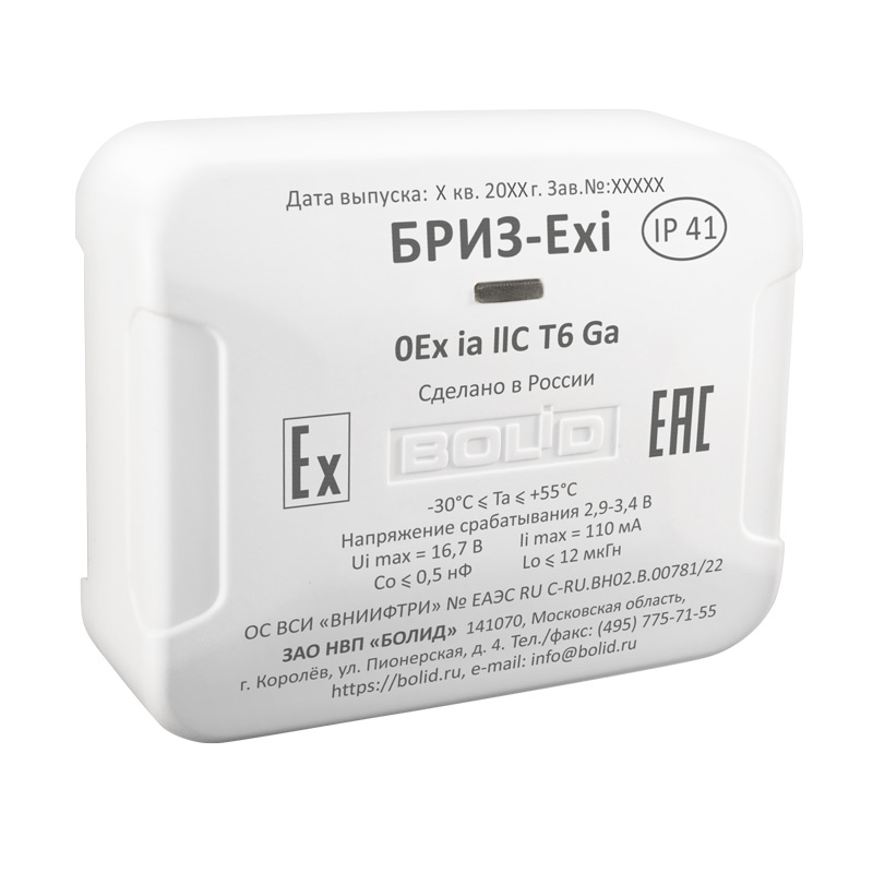 БРИЗ-Exi — это специализированный взрывозащищённый блок разветвительно-изолирующего типа, предназначенный для эксплуатации во взрывоопасных помещениях. Он устанавливается в искробезопасную двухпроводную линию связи контроллеров «С2000-КДЛ» и автоматически изолирует участок при коротком замыкании, восстанавливая связь после устранения неисправности. Конструкция блока обеспечивает класс взрывозащиты «ia» для газовых смесей группы IIC при температурном классе T6, что подтверждается маркировкой 0Ex ia IIC T6 Ga. Внутри корпуса применены стабилитроны для ограничения входного напряжения, лакокрасочное покрытие и компаундинг, обеспечивающие требуемые электрические зазоры и устойчивость к внешним воздействиям.