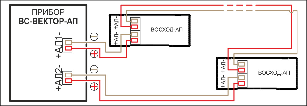 - К адресной линии прибора «ВС-ВЕКТОР-АП250» может быть подключено до 200 оповещателей «ВОСХОД-АП-01».