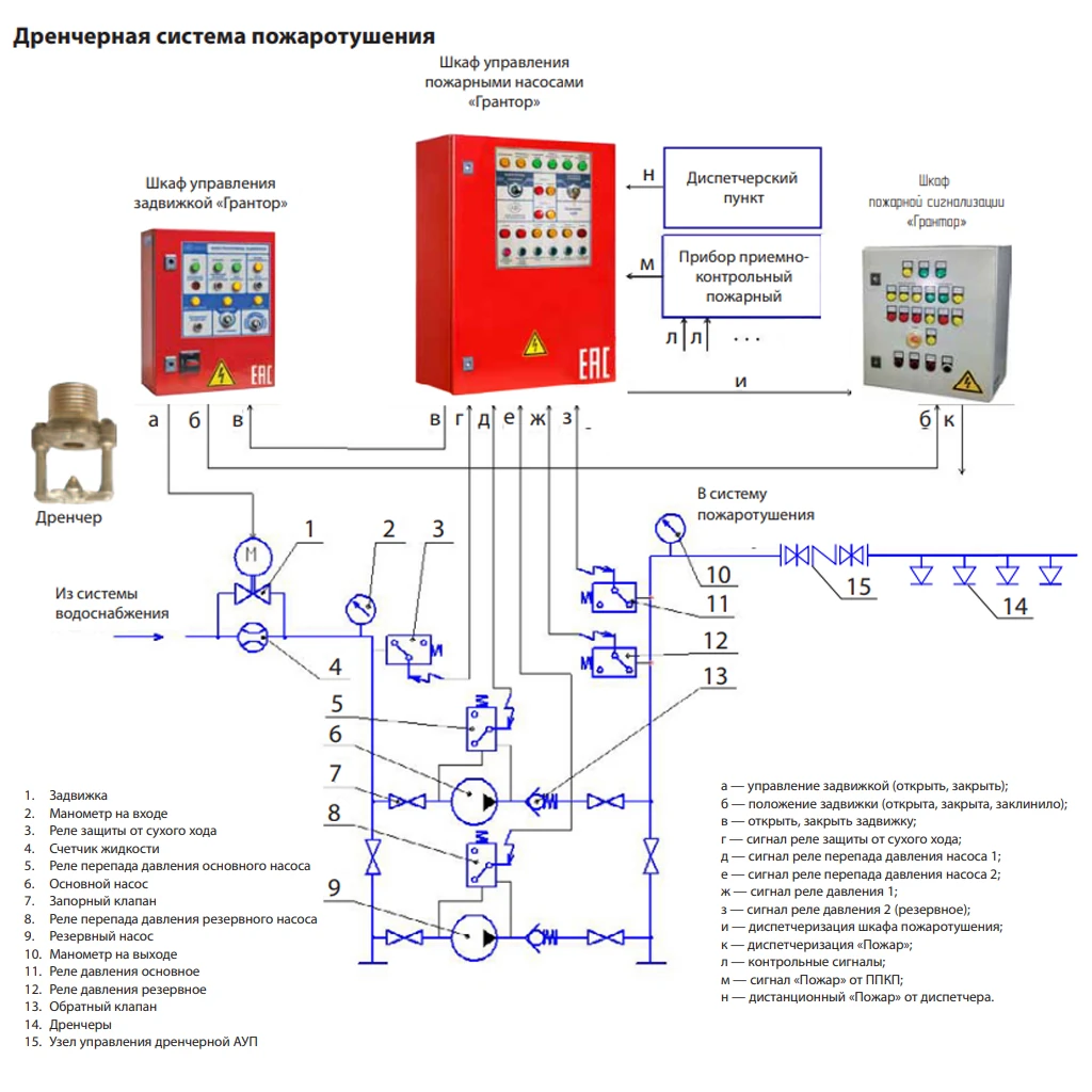 - Выходные сигналы: «Работа/Авария» каждого насоса, питание на каждом вводе, режим «Пожар», «Общая неисправность», «Блокировка/Автоматика отключена», управление задвижкой «Открыть/Закрыть»