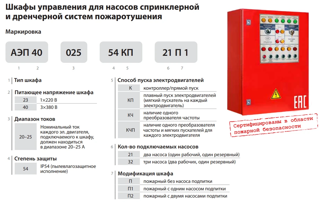 Шкаф имеет металлический корпус с классом защиты IP54 и навесным исполнением с нижним вводом кабелей. Модификация АЭП40-003-54КП-21П оснащена мягким пускателем Grancontrol 3V40 и системой автоматического ввода резерва (АВР). Поддерживает защиту от несанкционированного доступа и соответствует требованиям ГОСТ Р 53325-2012. Подходит для применения на пожарных насосных станциях, в инженерных системах зданий и объектах с повышенными требованиями к надёжности.