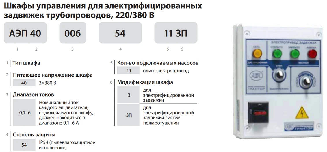 Модификация АЭП40-006-54-11ЗП отличается наличием интерфейса RS-485 для диспетчеризации состояния задвижки и аварийных сигналов, а также металлическим корпусом повышенной механической прочности. На лицевой панели располагается световая индикация состояния «Открыто», «Закрыто», «Авария» и «Сеть». Шкаф соответствует требованиям отраслевых стандартов и предназначен для эксплуатации в технических помещениях, инженерных узлах и системах автоматизации.