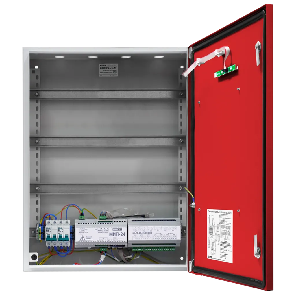 ШПС-24 исп.12 имеет степень защиты корпуса IP54 и красную дверь.ШПС предназначены для размещения в них приборов пожарной автоматики, приёмно-контрольных приборов охранно-пожарной сигнализации, обеспечения их напряжением питания 24 В, обеспечения связи приборов по интерфейсу RS-485 между собой и внешними контроллерами с учетом требований СП 484.1311500.2020. ШПС рассчитаны на совместное использование с ППКУП "Сириус", пультом контроля и управления охранно-пожарным "С2000М" и их исполнениями.