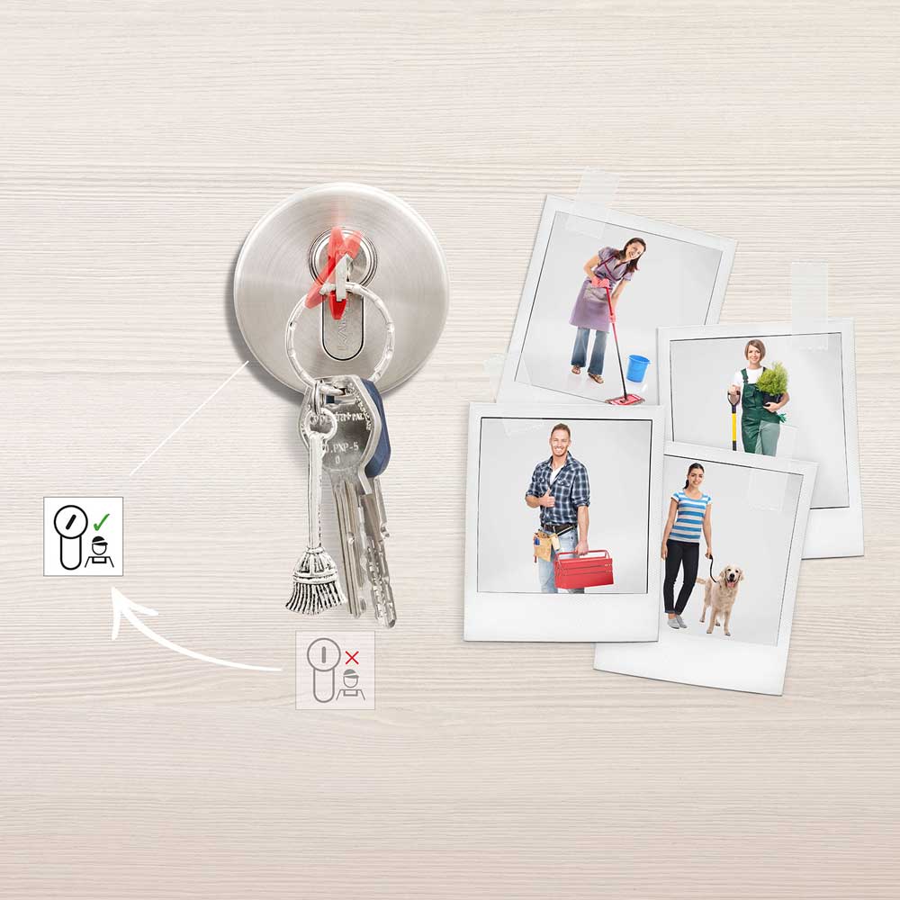При извлечении ключа владельца в стандартном вертикальном положении (на 6 часов), служебный ключ не может отпереть дверь. Если дверь заперта служебным ключом изнутри, то ключ владельца все еще может отпереть дверь снаружи в положении "8 часов". Владелец имеет доступ в любое время, даже если служебный ключ находится в цилиндре замка с внутренней стороны. Вы также можете определить, какие двери служебный ключ может открыть внутри вашего помещения, а какие нет. Мы с радостью поможет вам найти лучшее решение для вашего дома.