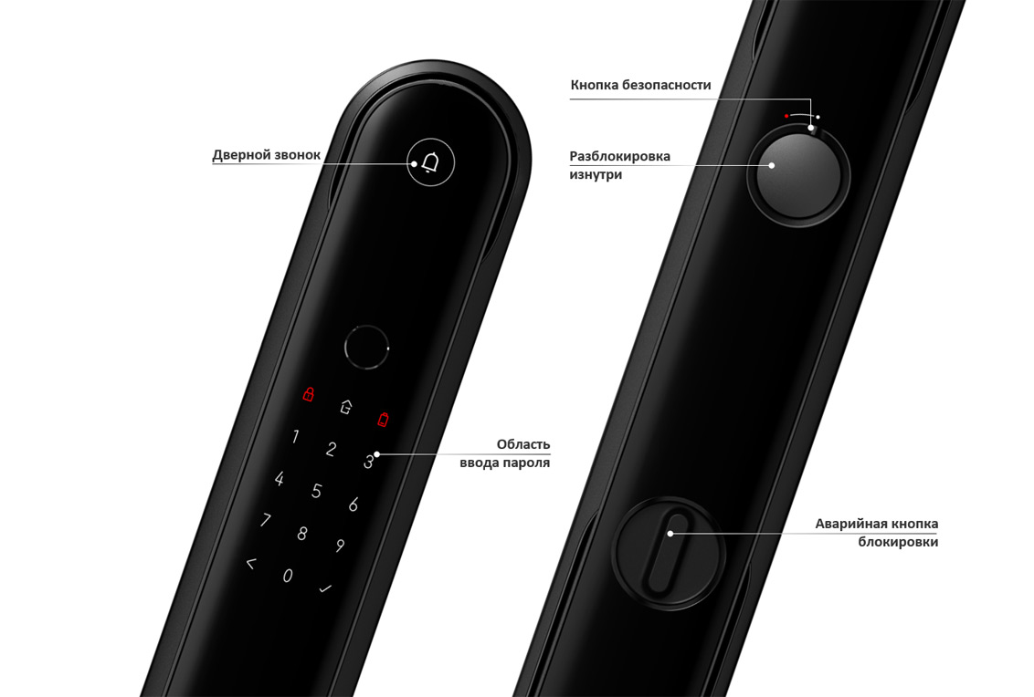 • Способы открытия: Отпечаток пальца, пароль, временный пароль, механический ключ, Bluetooth, NFC, HomeKit, ключ Apple home, удаленная разблокировка, периодический пароль, Google Assistant