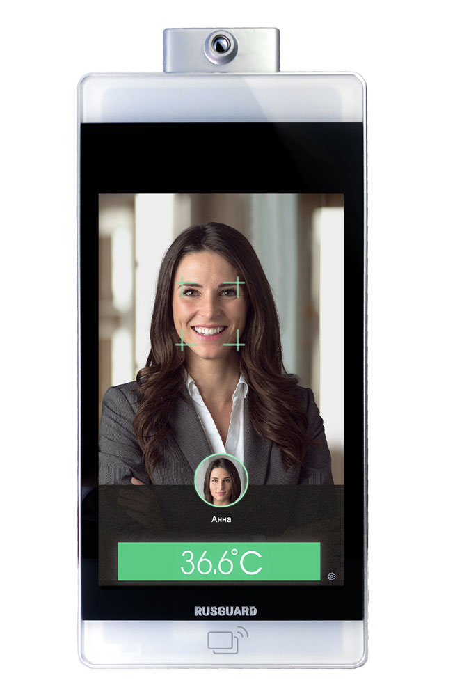 Бесконтактный инфракрасный термометр измеряет температуру в области лба человека в диапазоне от +34С до +42С. Точность измерения температуры ±0,3 С°. Пользователю может быть отказано в доступе, если его температура, превысит заданный порог, например +37С°. Настроить допустимые значения температуры, и другие параметры терминала возможно централизованно по сети. Данные о результатах измерения температуры хранятся в базе данных.