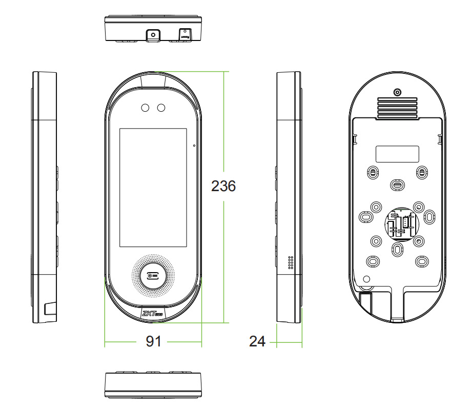 • Функции: Идентификационная карта, ADMS, вход T9, летнее время, камера, 9-значный идентификатор пользователя, уровни доступа, группы, праздники, защита от повторного прохода, запрос записи, тампер, несколько методов проверки, распознавание ладони, WiFi