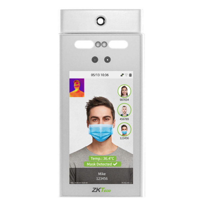 Терминал оснащен тепловизорной камерой, отображающей изображение на экране и специализированным процессором ZKTeco для распознавания лиц и новейшей технологии компьютерного зрения. Технология бесконтактного распознавания и новые функции обнаружения повышенной температуры, и определение наличия маски - все это особенно актуально в нынешней ситуации распространения вирусных инфекций.