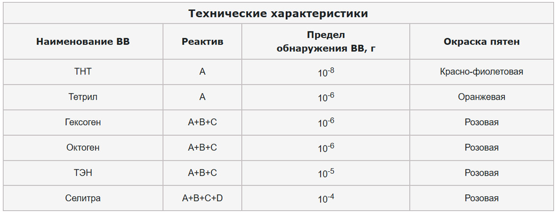 По сравнению с комплектом «Поиск-ХТ» он также определяет наличие аммиачной селитры и дымного пороха.